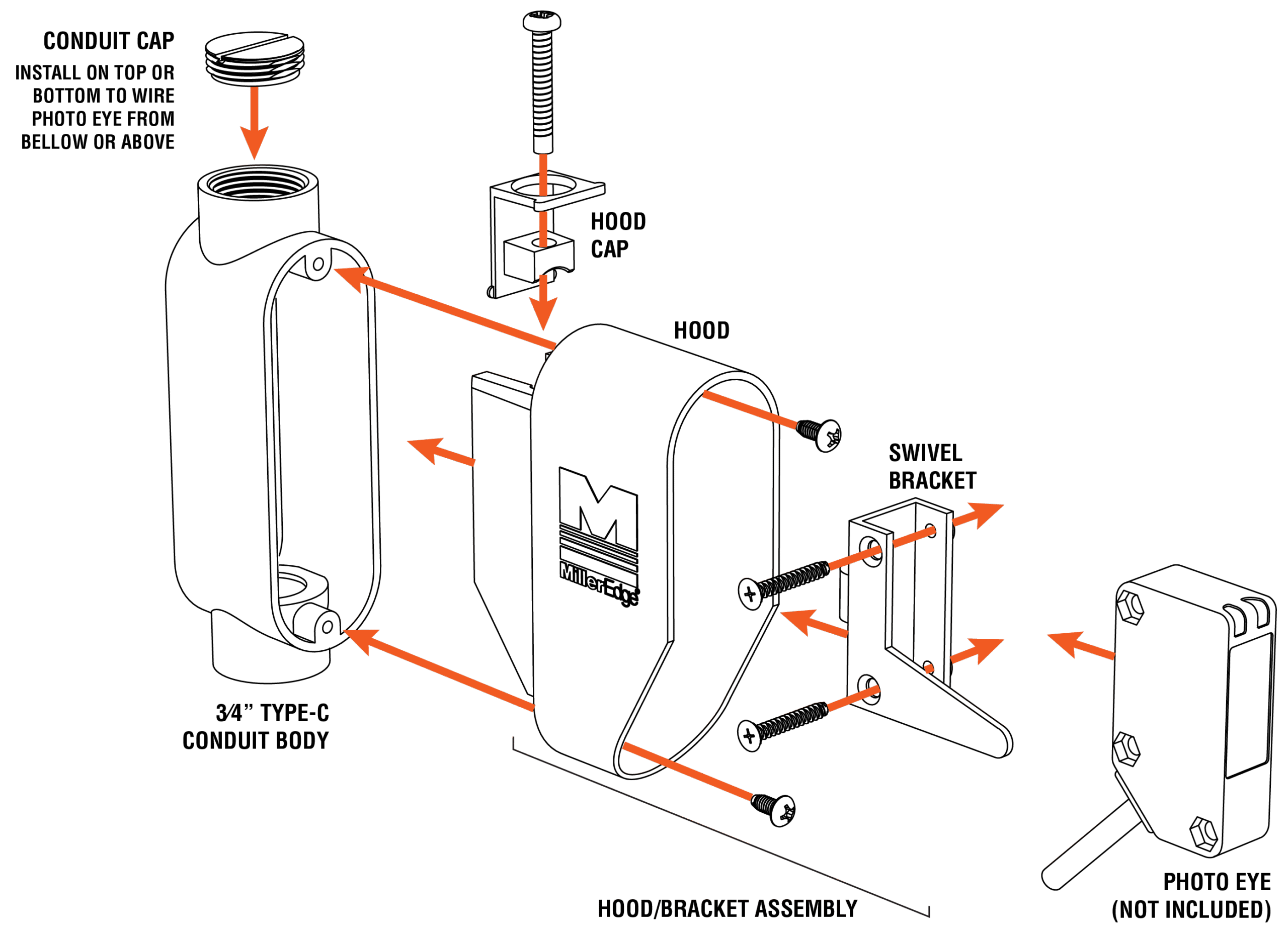 The Photo Eye Conduit Enclosure Kit (PE-CON-K10) pairs seamlessly with TruGuard™ and OptiGuard™ photo optic systems by Miller Edge. The integrated 3⁄4” type-C conduit body provides a protective pathway for wires in installations using conduit while ensuring a clear connection to operator controls. This accessory features a hood designed to provide added shielding to the photo eye from sunlight, weather, dust, and debris. With a swivel bracket for easy alignment, the Photo Eye Conduit Enclosure Kit ensures optimal positioning of an accompanying photo eye or reflector.